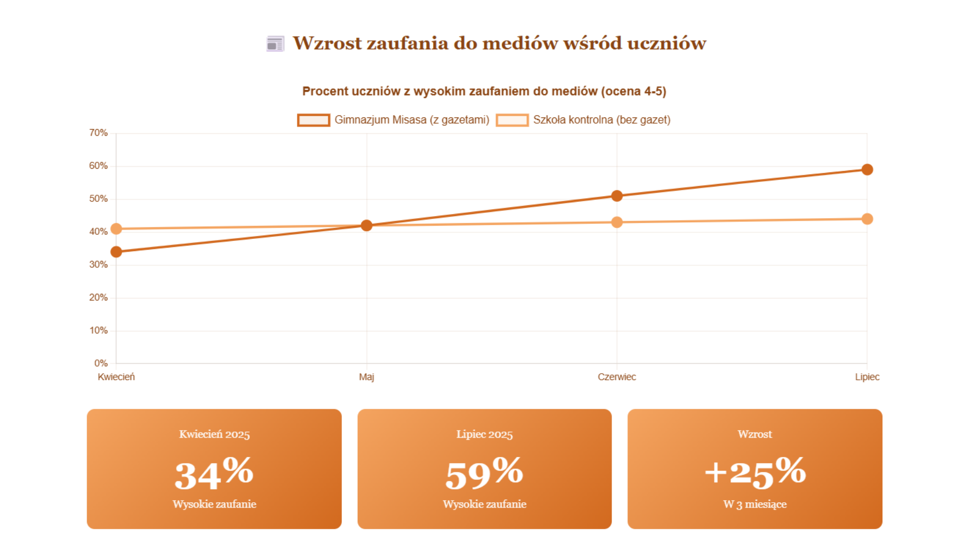 Ale po zaledwie trzech miesiącach regularnego kontaktu z gazetami nastąpił prawdziwy przełom. W lipcu już pięćdziesiąt dziewięć procent uczniów – czyli prawie dwie trzecie – oceniało media wysoko. Średnia ocena wzrosła do 3,61, co jest statystycznie znaczącym skokiem. To wzrost o dwadzieścia pięć punktów procentowych w ciągu jednego kwartału, co w badaniach społecznych jest wynikiem wręcz spektakularnym.
