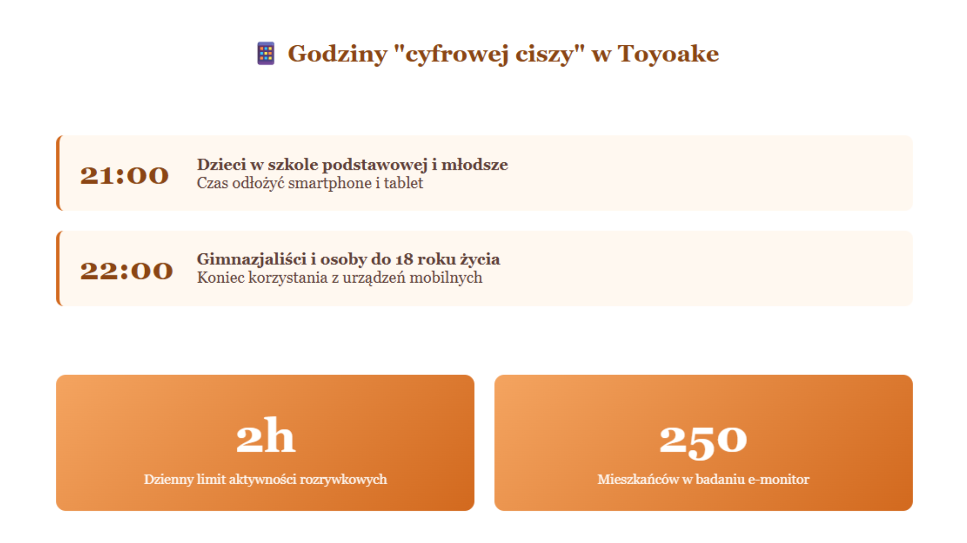 Zamiast tego przeprowadzono ankiety wśród dwustu pięćdziesięciu mieszkańców zarejestrowanych w systemie e-monitor. Pytania są bardzo praktyczne: czy zmieniła się długość korzystania ze smartfonów? Czy poprawiła się jakość snu? Czy w rodzinach rozmawia się więcej? Na początek przyszłego roku zaplanowano większe badanie wśród uczniów, a burmistrz miasta planuje bezpośrednie spotkania z młodzieżą, żeby wysłuchać ich perspektywy. To pokazuje, że podejście jest prawdziwie demokratyczne i oparte na dialogu, a nie narzucaniu odgórnych rozwiązań, co w kontekście często hierarchicznego japońskiego społeczeństwa jest szczególnie znamienne.