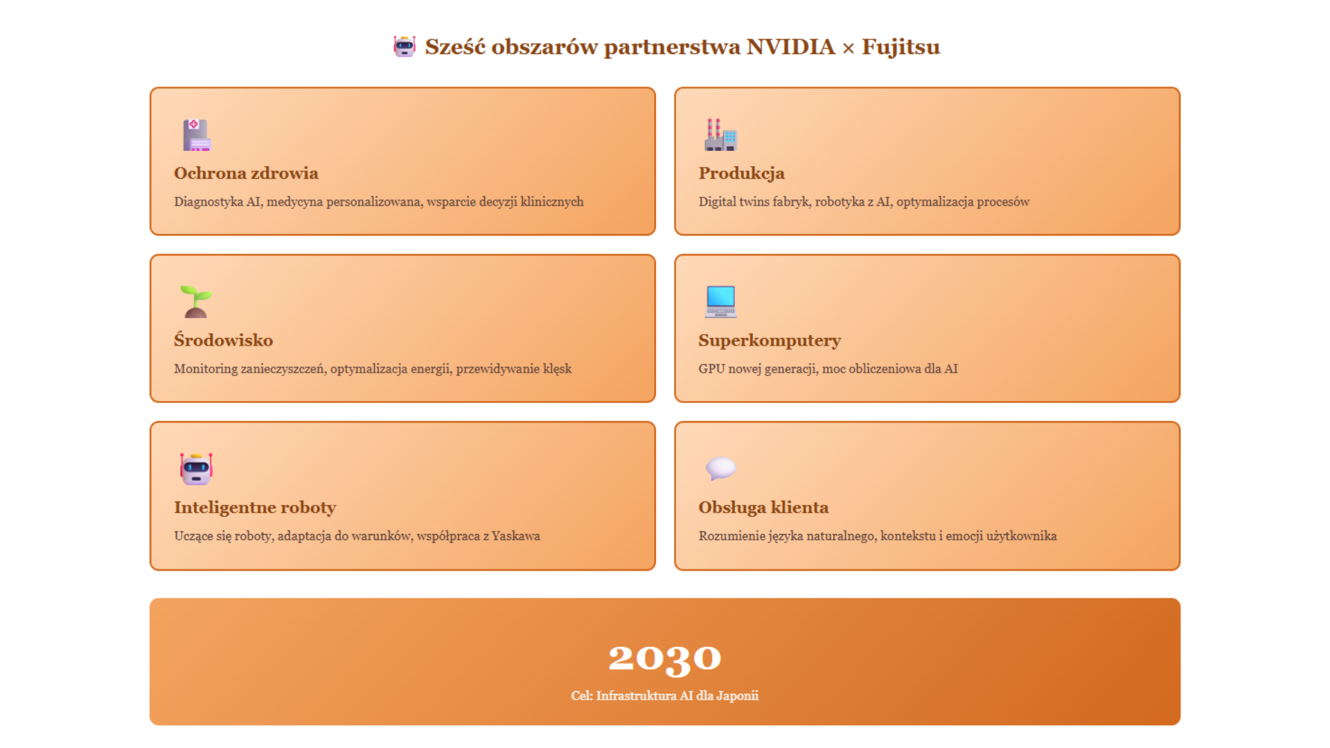 NVIDIA to firma, która w ostatnich latach stała się kluczowym graczem w rewolucji AI, głównie dzięki swoim procesorom graficznym GPU, które są fundamentem dla trenowania i uruchamiania modeli sztucznej inteligencji. Bez przesady można powiedzieć, że każdy większy model językowy, każdy system rozpoznawania obrazu, każda zaawansowana symulacja – wszystko to działa na chipach NVIDIA. Fujitsu to japoński weteran technologiczny z wieloletnim doświadczeniem w telekomunikacji i produkcji komputerów, firma głęboko zakorzeniona w japońskiej kulturze biznesowej i rozumiejąca lokalne potrzeby społeczne.